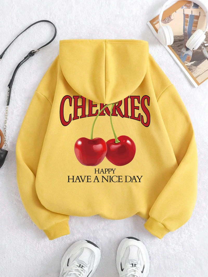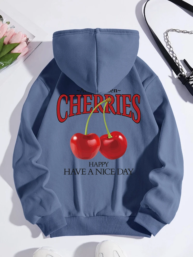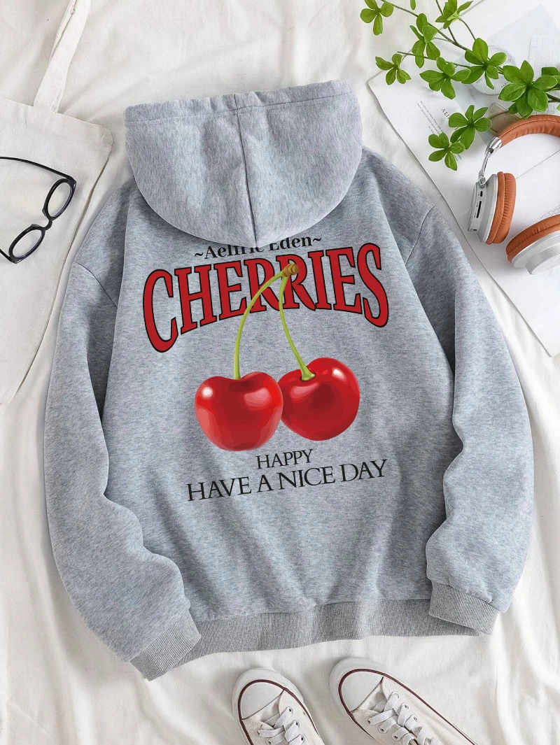 Aelfric Eden Cherries Hoodies Womens Cherry Printing Sweatshirt Soft Breathable Loose Pocket Pullover Winter Womans Streetwear