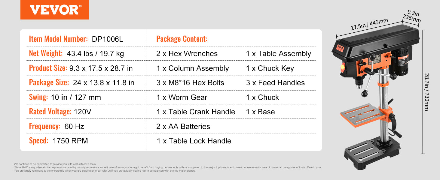 VEVOR 10-Inch benchtop drill press comes with a 5-speed adjustment and a powerful 3.2A induction motor to give you constant power to drill through wood and metal. Perfect for wood studios and labs, and can support your DIY creations and machining.