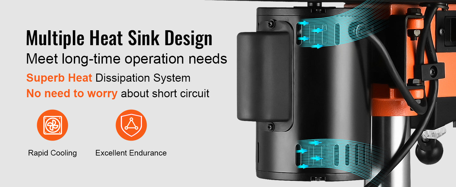 The desktop drill press has fast heat dissipation to reduce the machine’s internal temperature, ensuring long time usage.